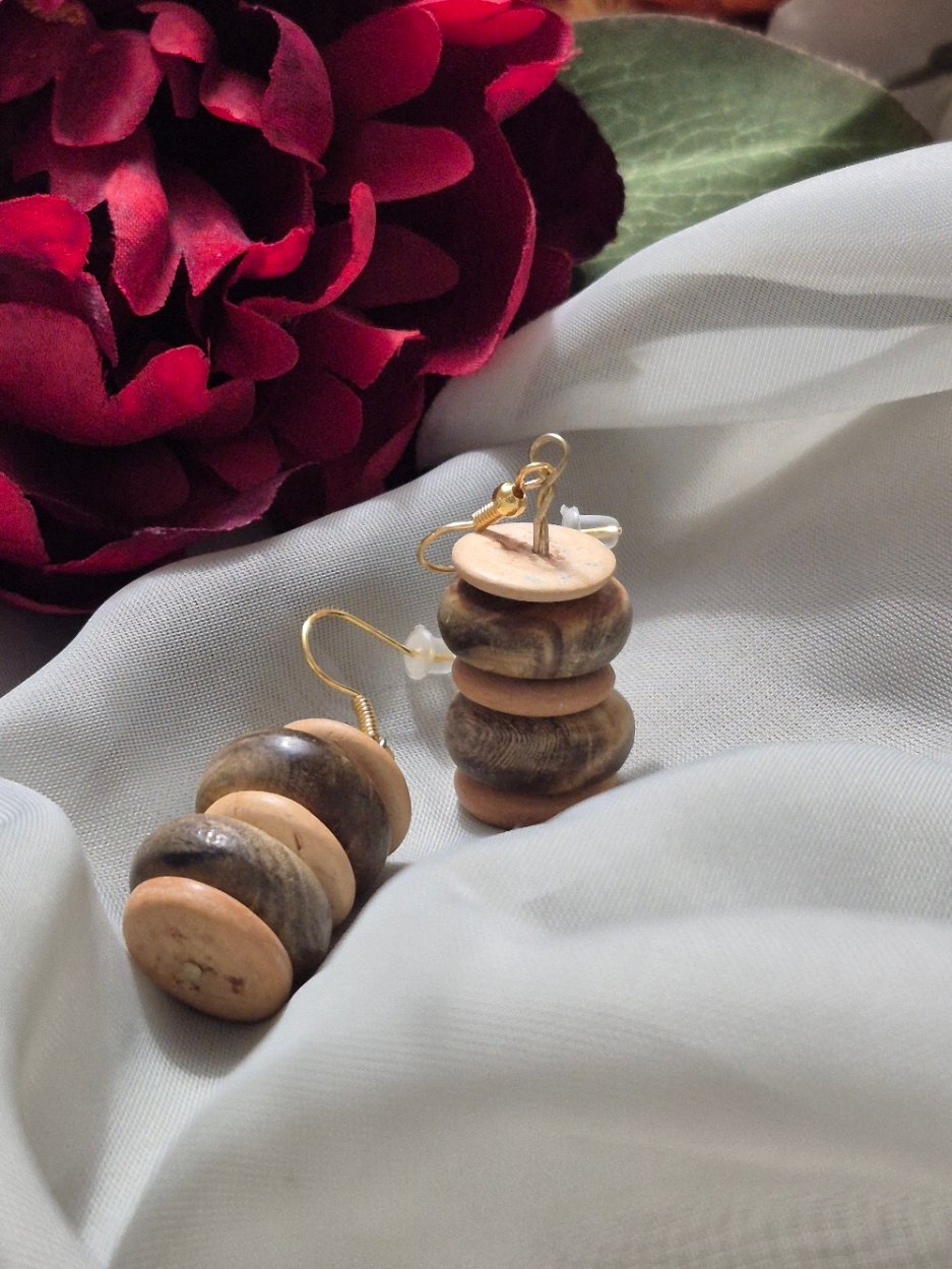 • Materials: natural wood or bone‑style disc beads; gold‑tone earring hooks.