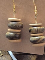 A pair of artisan drop earrings that celebrate natural materials and simple, layered design. Each earring features a vertical stack of round disc beads in earthy brown and beige tones, finished with warm gold hooks for a polished contrast. Lightweight and tactile, these earrings bring a handcrafted, organic accent to casual and dressier outfits alike.